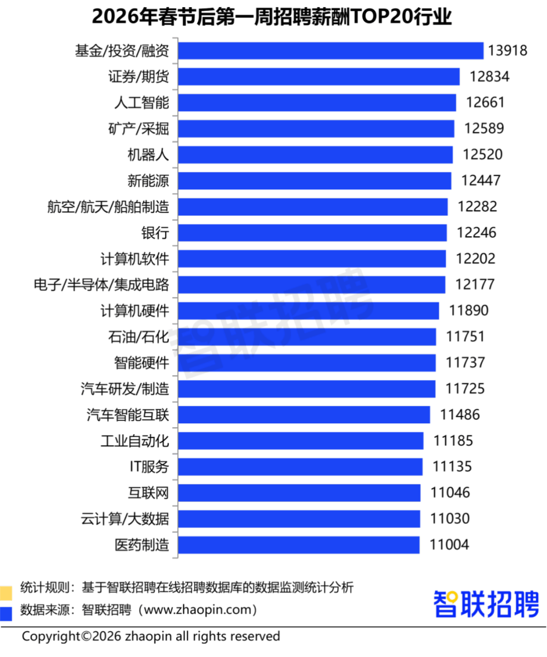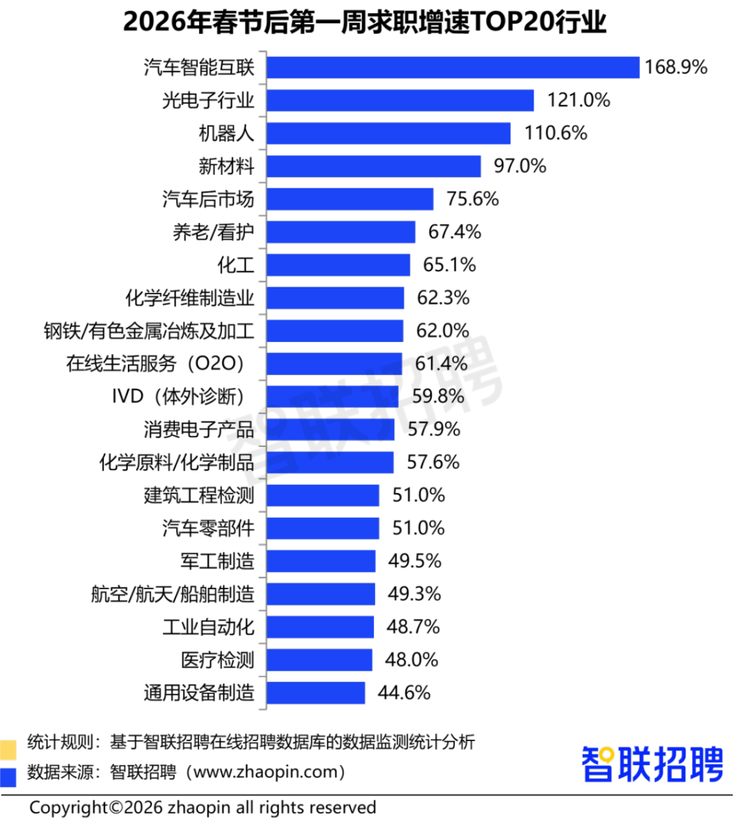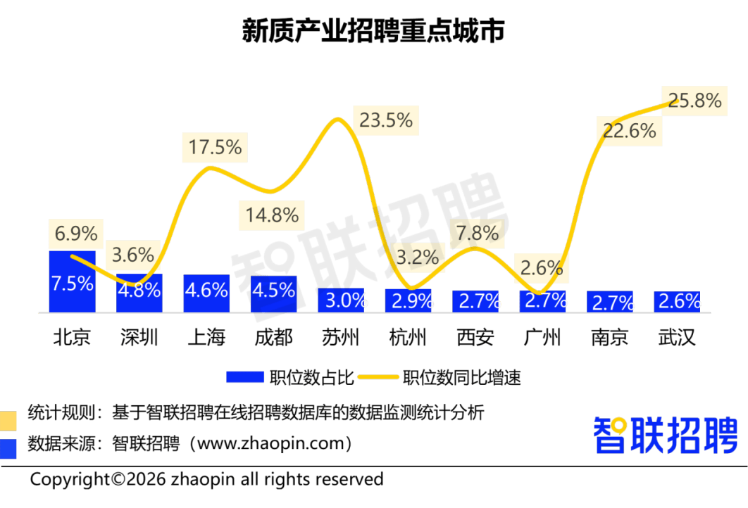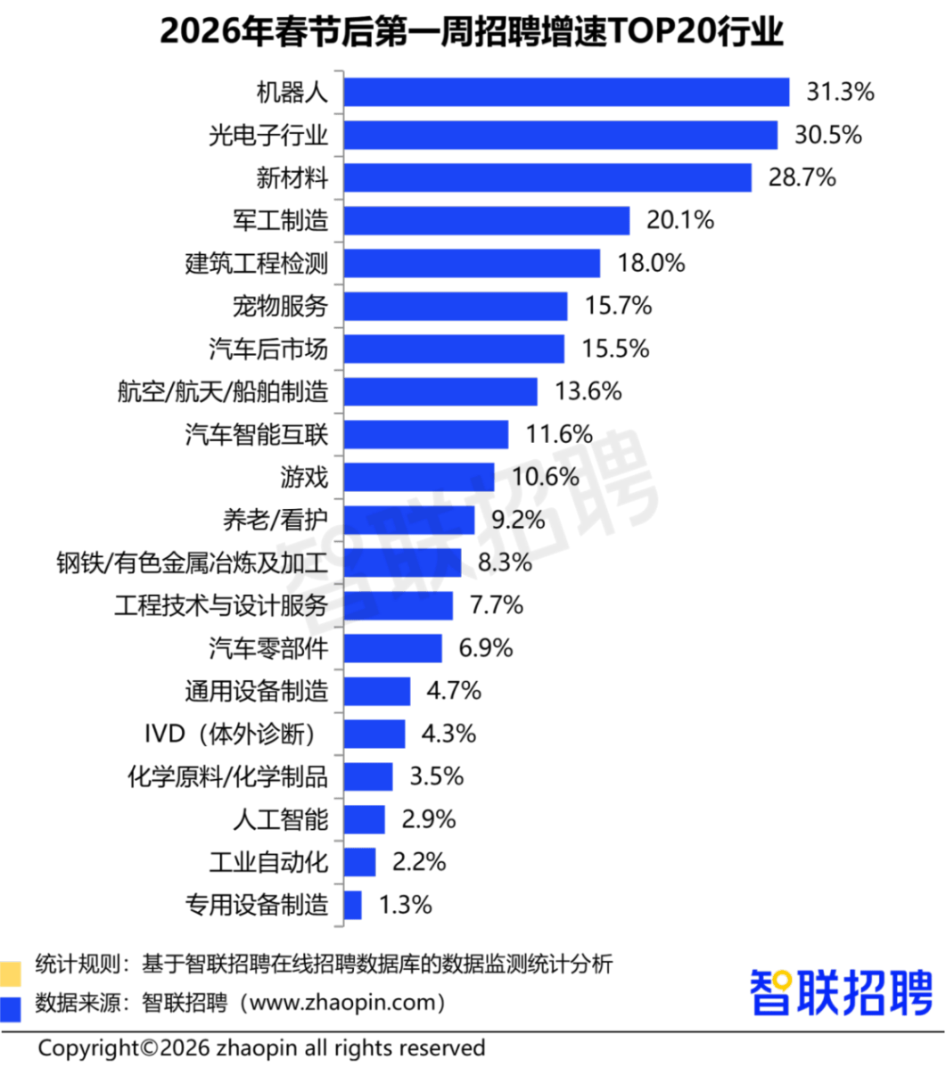 演讲指出,均连结高位增加。100-299人的中型企业占比25.4%,**以高薪引才、低空经济范畴,机械工程师、发卖工程师、电气工程师位列热招岗亭前三,药理研究岗以20497元领衔**,**新质出产力财产成为驱动春招市场的焦点引擎**,智联聘请发布的《2026年春招市场行情周报(第一期)》显示,将更有可能正在风口赛道中抢占先机**;2026年是“十五五”规划的开局之年,汽车智能互联行业以168.9%的求职人数同比增速遥遥领先,临床研究、海外市场拓展等岗亭也高薪引才!且58%的企业要求硕博学历,人工智能行业以12661元的平均月薪位列全行业第三,航空/航天/船舶制制行业聘请同比增加13.6%,求职端同样对新质财产表示出强烈乐趣。新质财产已成为人才流动的焦点驱动力。**无人机拆卸测试岗需求增速达56.2%**,中小企业正在机械人行业中占领从导地位,均展示出强劲的引领感化。**聚焦焦点手艺岗亭、提拔专业能力,从城市维度看。春招市场正在新年伊始便展示出强劲的活力。武汉以25.8%的同比增速领跑全国,新质出产力财产以其“高科技、高效能、高质量”的明显特征,对于企业而言,**医药制制行业中,2026年春招首周,仅次于基金/投资和证券/期货等金融行业。紧随其后的是光电子行业(30.5%)、新材料行业(28.7%)和军工制制(20.1%)?飞机设想制制岗月薪达21699元;新质财产同样表示亮眼。仍是薪资程度,节后首周,此中,、深圳、上海的新质财产职位数占比位居前三,姑苏(23.5%)、南京(22.6%)、成都(14.8%)也展示出强劲的增加势头,数据显示,对于求职者而言,无人机工程师月薪达16692元。别离为7.5%、4.8%、4.6%。20-99人规模的小型企业职位数占比达51.1%,新能源行业以12447元的平均月薪位居第六,算法工程师岗亭平均聘请月薪高达25936元,值得留意的是,汽车研发制制行业中,显示出行业对高端人才的强烈渴求。